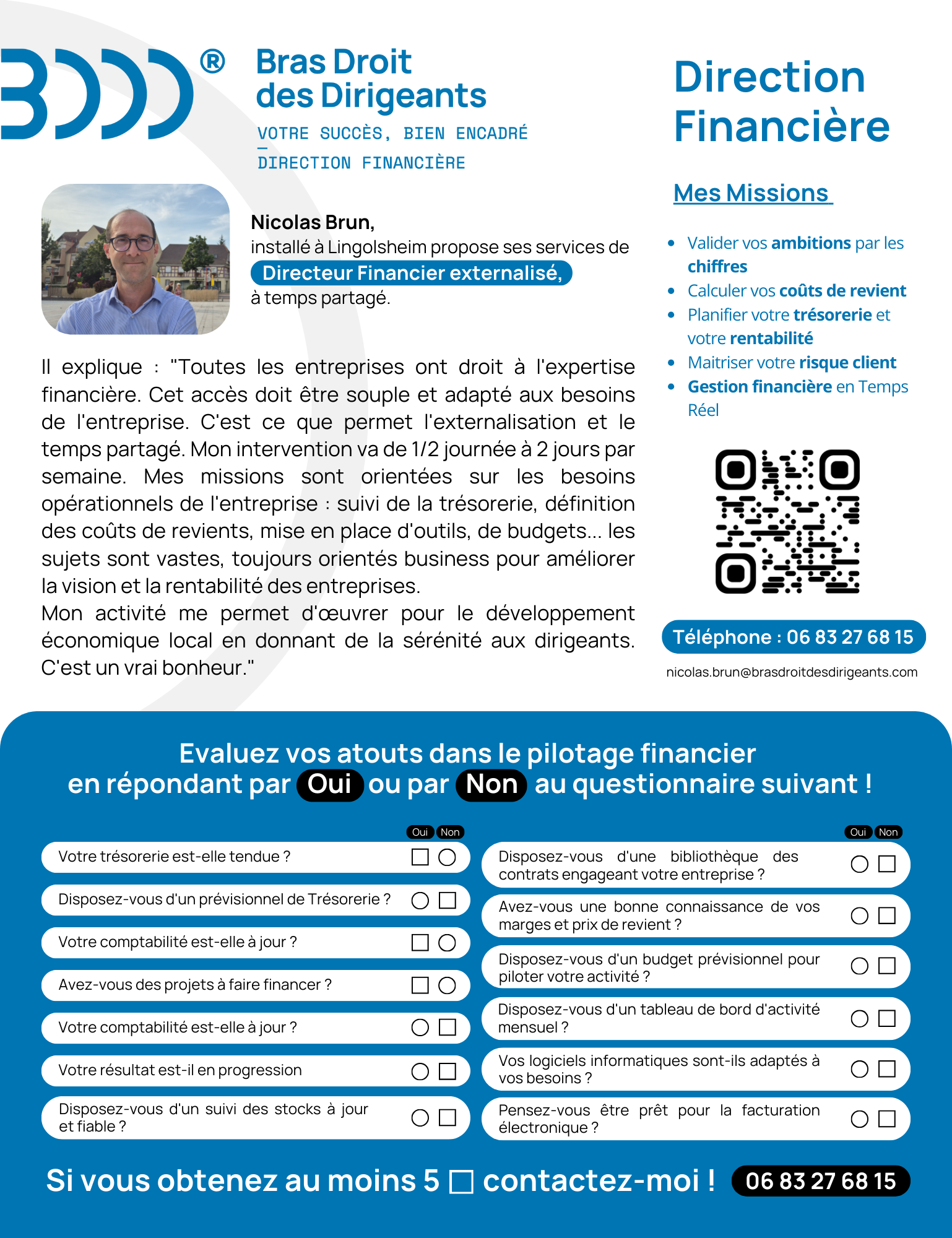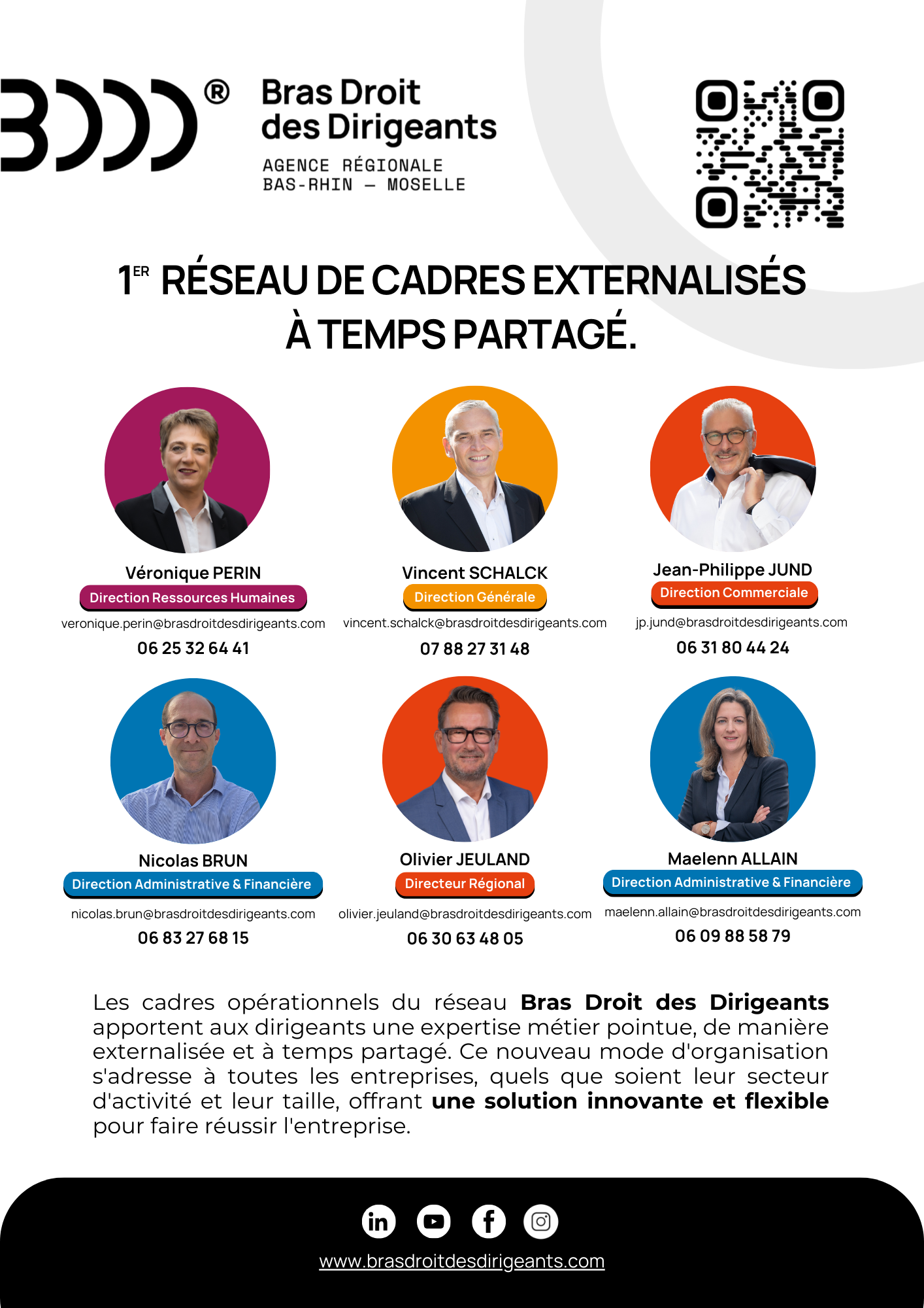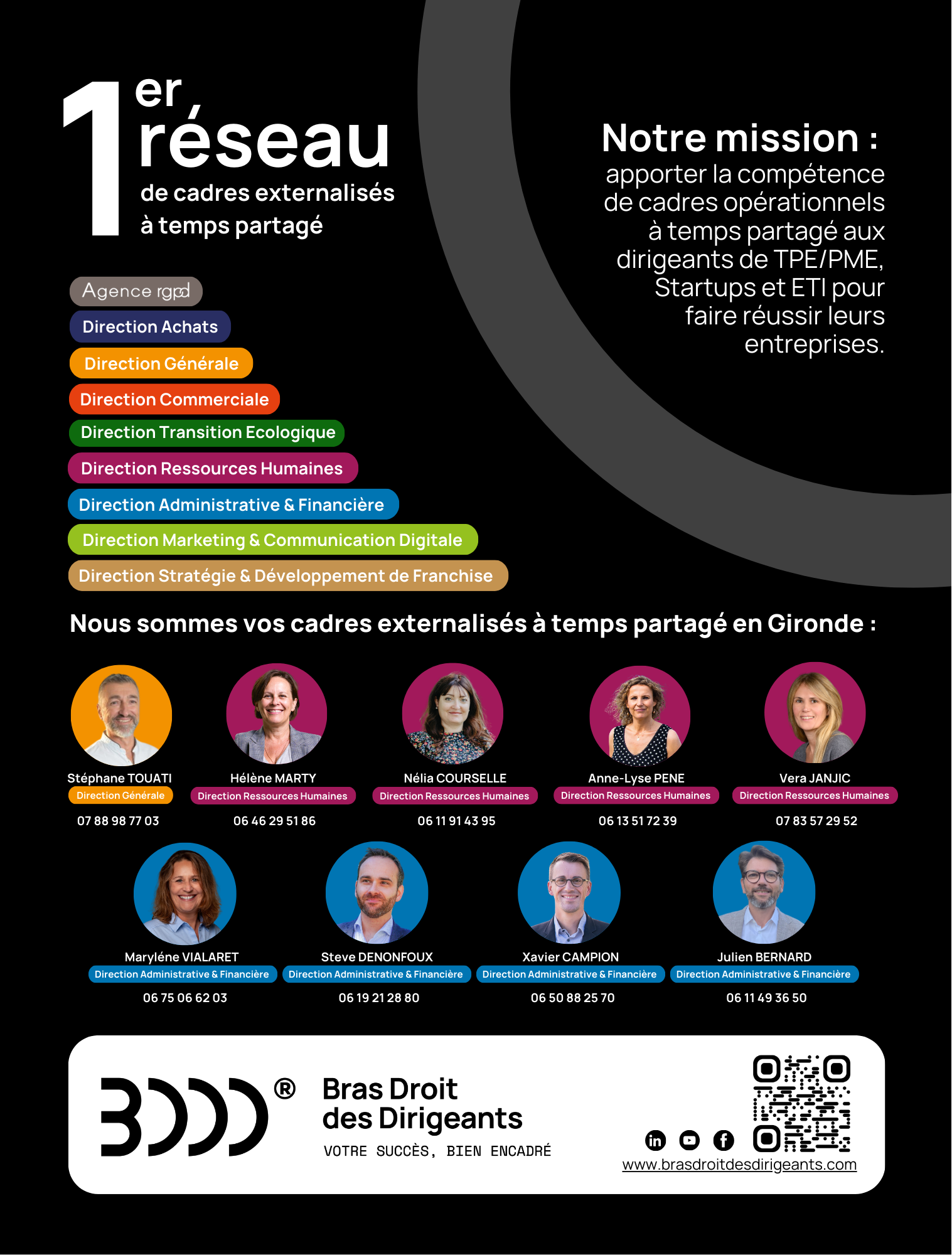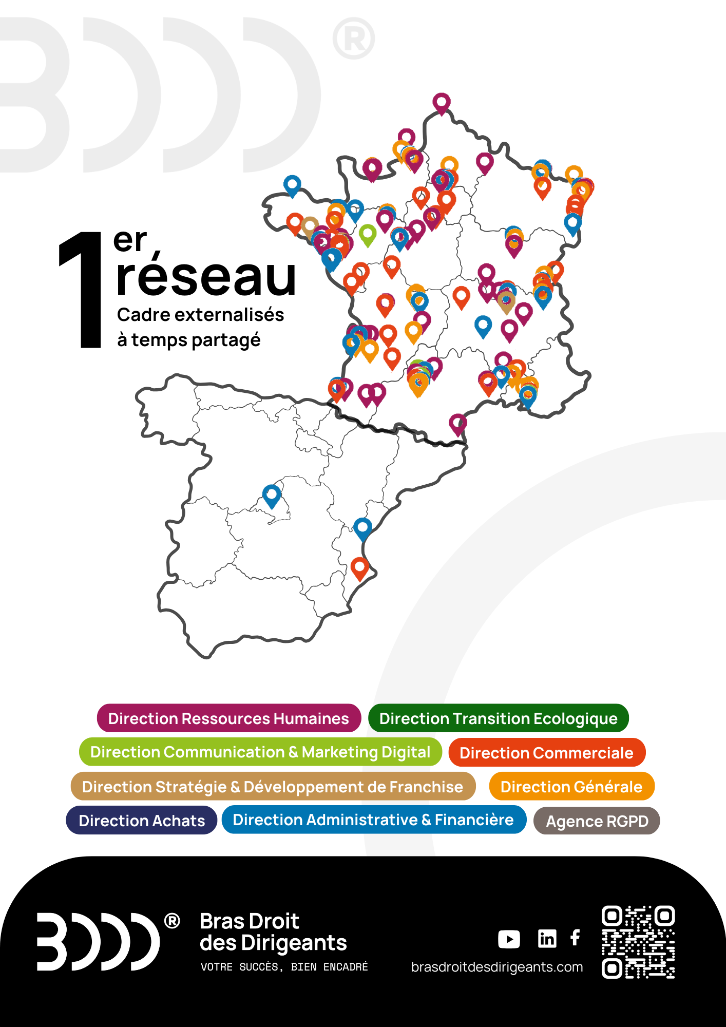Bras Droit des Dirigeants est un réseau national de franchise qui accompagne les chefs d’entreprise dans leur développement commercial, RH, financier et stratégique. Présent sur tout le territoire, il réunit plus de 220 franchisés experts.